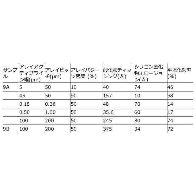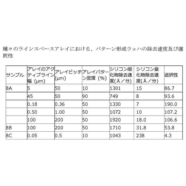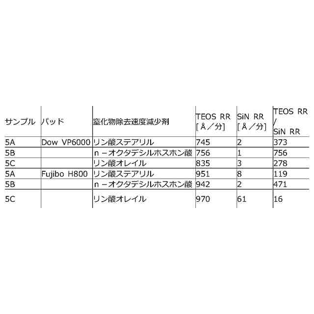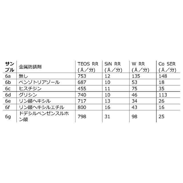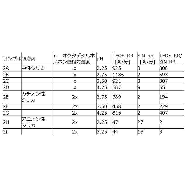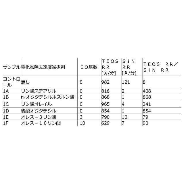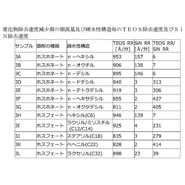 )を比較的高い材料除去速度(MRR)で研磨し、シリコン窒化物(例えばSiN)又は関係する膜(例えばタングステン及びコバルト)に対してはストップオンするか又は非常に低い速度で研磨することができる。例えば、本開示に記載の研磨組成物で除去が可能なシリコン酸化物としては、TEOS、(例えば、オートクレーブにより誘導されるベア(bare)シリコンの酸化により生じる)熱酸化物(TOX)、プラズマPVD(plasma enhanced PVD)蒸着(例えば高密度プラズマ又は高アスペクト比プラズマ)により形成されるシリコン酸化物、プラズマ後の表面硬化を伴うCVD蒸着により形成されるシリコン酸化物、炭素ドープシリコン酸化物(SiOC)、及び酸化物前駆体の液体付与及びこれに続く光又は熱に誘導される硬化により形成されるシリコン酸化物が含まれる。いくつかの例では、高MRRで除去する対象となる標的膜は、シリコン酸化物誘電体ではなく、金属又は金属酸化物又は金属窒化物であってもよい。金属、金属酸化物及び金属窒化物の一般的な例としては、金属については、銅、コバルト、ルテニウム、アルミニウム、チタン、タングステン、及びタンタル、金属酸化物については、酸化ハフニウム、酸化チタン、酸化アルミニウム、酸化ジルコニウム、及び酸化タンタル、並びに、ルテニウムの窒化物、アルミニウムの窒化物、チタンの窒化物、タングステンの窒化物、及びタンタルの窒化物が挙げられる。そのような場合、ストップオン/低除去速度膜は依然としてシリコン窒化物膜とすることができ、本開示に係る窒化物除去速度減少剤を含む研磨組成物は所望の選択性を達成するために利用することができる。