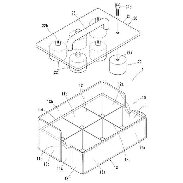上記した課題を解決するため、発明にかかる保持枠付き容器の組み立て治具を、基台と、蓋から構成したのである。そして、基台は、少なくとも上方に開口する筒状の枠体と、前記枠体の内部空間を格子状に小部屋に仕切る仕切りと、を有し、前記枠体の上縁と前記仕切りの上縁とは同一平面の支持面を構成するものとしたのである。また、蓋は、蓋板と、前記蓋板の下面に前記基台の小部屋に1対1に対応するように設けられ、前記蓋板を前記基台に被せた際に、前記小部屋にそれぞれ入り込む複数の杵部と、を有するものとしたのである。