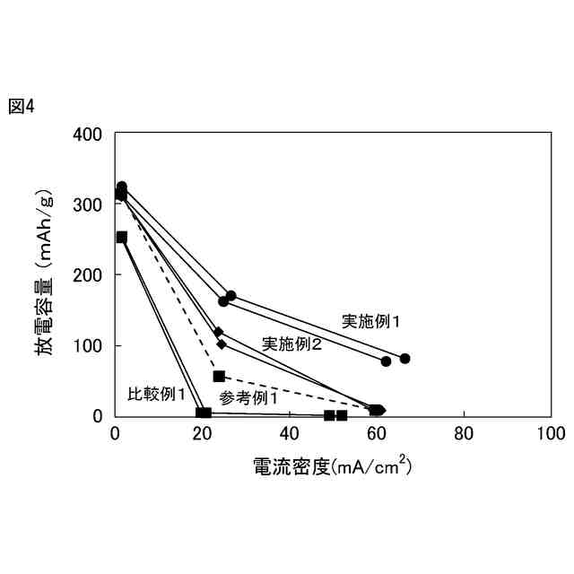 図4は、実施例1~2、比較例1、及び参考例1の試料それぞれについて、電流密度と放電容量の関係を示すグラフである。