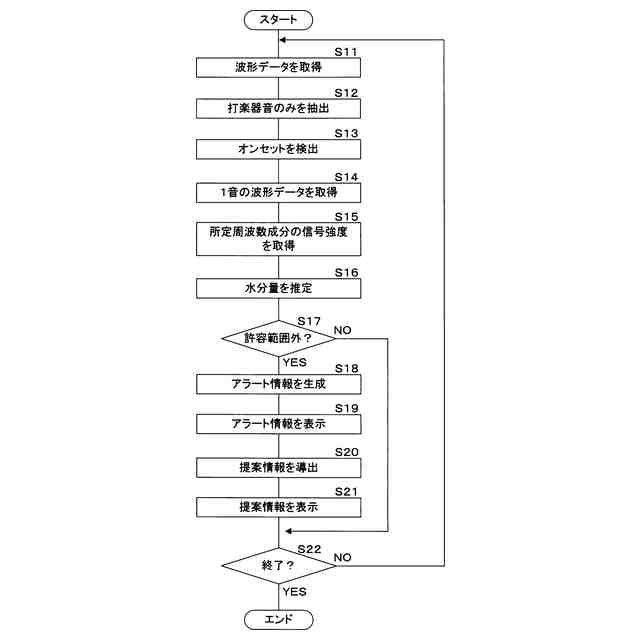 抽出した前記打楽器音成分の強度に基づいて、前記水分量を推定する