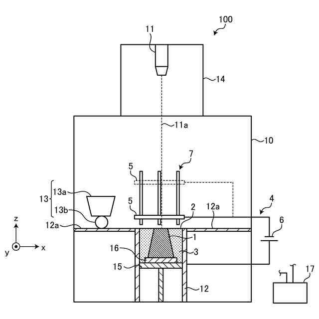 三次元造形装置では、造形中に粉末が負に帯電し、粉末の粒子が反発し合うことによって粉末が飛散する、いわゆるスモーク現象が発生することが知られている。スモーク現象が発生すると、正常な粉末層が形成されず、造形不良となるおそれがある。そこで、三次元造形装置では、造形用の電子ビームを照射する前に、予熱用の電子ビームを粉末層に直接照射して仮焼結し、造形用の電子ビームを照射した際における粉末の帯電を抑制することとされている。例えば、特許文献1では、造形面上に散布された粉末のうち、電子ビームの照射を受けない未焼結領域を覆うチャージシールドを備えた三次元積層造形装置が開示されている。チャージシールドは、電子銃からの電子ビームを通過させる開口部を有する。この三次元積層造形装置では、チャージシールドの開口部を通じて予熱用の電子ビームを粉末に照射し、照射領域の粉末を仮焼結させる。