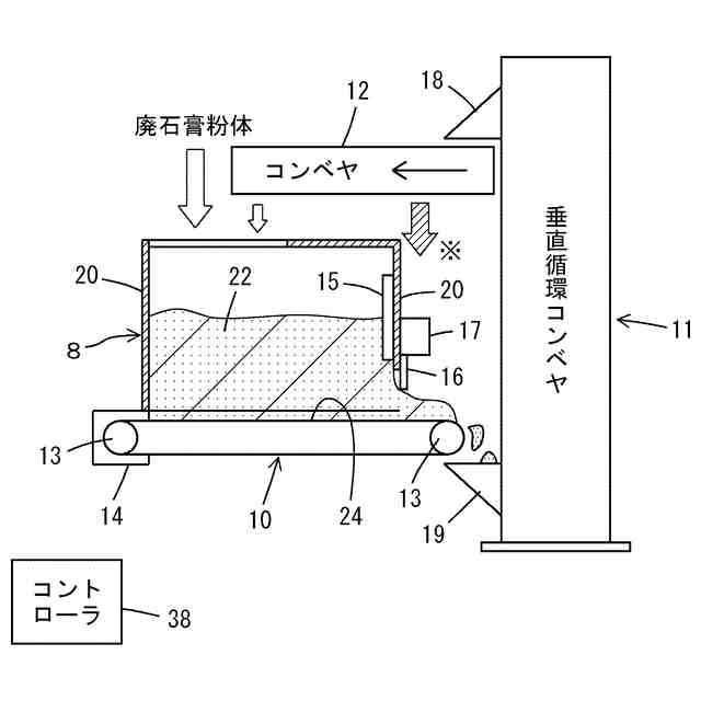 廃石膏粒体を貯蔵すると固化しやすい。このため容器からの廃石膏粒体の排出自体が難しくなる。そこで発明者らは容器の底部にスクリューコンベヤを設け、廃石膏粒体をスクリューコンベヤにより強制的に排出することを、提案した(特許文献1:特開2023-36204)。