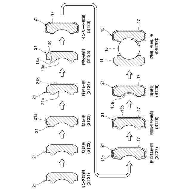 図2は、樹脂層を有しない外輪の形成手順、及び形成した外輪に内輪及び玉を組み付けた組立体を示す工程説明図である。