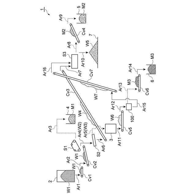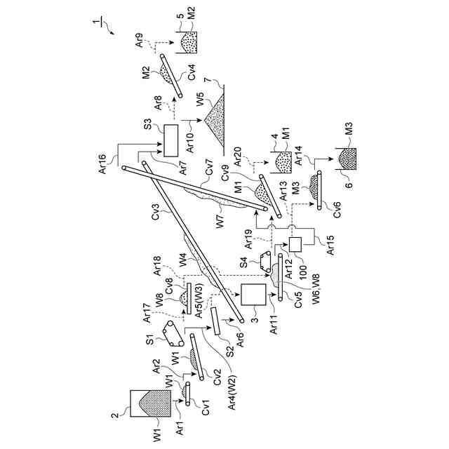 図1を参照して、焼却灰処理設備1の構成について説明する。焼却灰処理設備1は、例えば、ゴミ焼却灰中の主灰W1から、金属異物M1,M2や長尺物M3などを分離するように構成されている。主灰W1は、例えば、ストーカ炉等のゴミ焼却設備の炉底から排出される焼却灰である。一方、ゴミ焼却設備の排ガスと共に排出される灰は、飛灰という。焼却灰処理設備1は、搬送部Cv1~Cv7と、ホッパ2と、選別機S1~S3と、破砕機3と、振動篩機100とを備える。