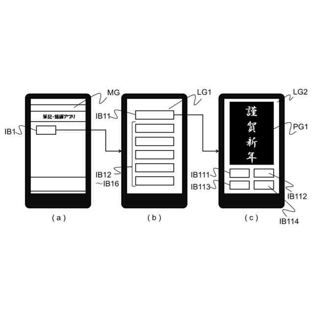 前記筆記描画対象として複数のアイコンボタンが表示された第1の下位階層画面と、