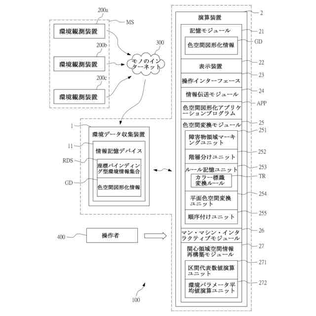 色空間変換モジュールは、環境パラメータ原始データに対してカラー標識変換ルールを構築し、カラー標識変換ルールは、複数の数値区間及び対応する複数の変換カラー標識を含むことにより、カラー標識変換ルールに基づいて座標バインディング型環境情報集合を色空間図形化情報に変換する。色空間図形化情報は、観測対象空間に対応する色空間画像を含み、色空間画像は、空間グリッド座標に対応する変換カラー標識により呈した複数の色グリッドブロックから構成されている。