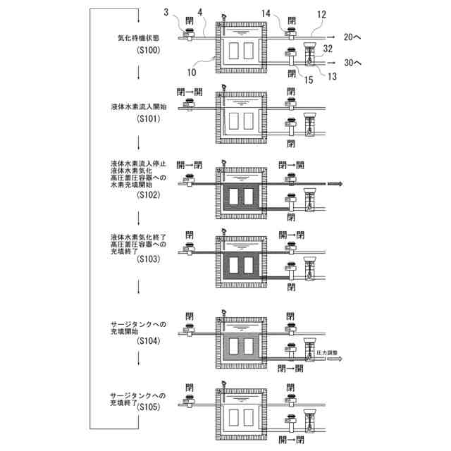 しかし、気化器内を閉塞する方法において、高圧蓄圧容器への充填後、気化器内の圧力を液体水素タンクの圧力以下に低下させないと液体水素の気化が行えないため、気化器内に残留した低圧の水素を大気中へ放出して圧力を低下させる方法が採られており、蓄圧容器への充填の度に大量の水素を無駄にしてしまう、といった問題があった。