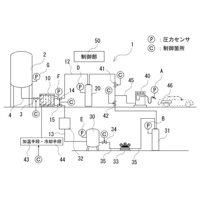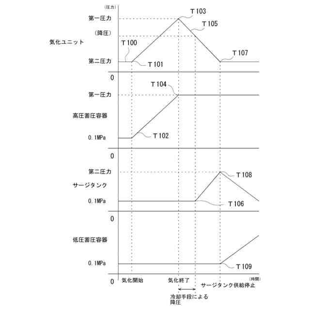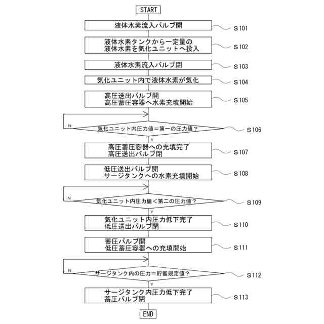 【解決手段】液体水素タンクと、気化ユニットと、圧力センサと、高圧蓄圧容器と、サージタンクと、低圧蓄圧容器と、ディスペンサと、制御部と、を備え、制御部は、圧力センサの検知結果にて第一の圧力値の時、高圧蓄圧容器への流路を閉じると共に、サージタンクへの流路を開き、圧力センサの検知結果にて第二の圧力値以下の時、サージタンクへの流路を閉じ、低圧蓄圧容器への流路を開く手段を採用する。