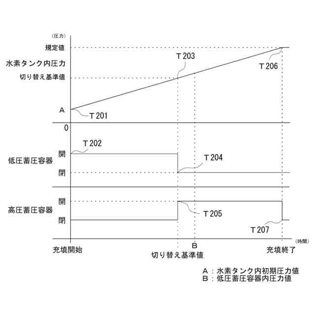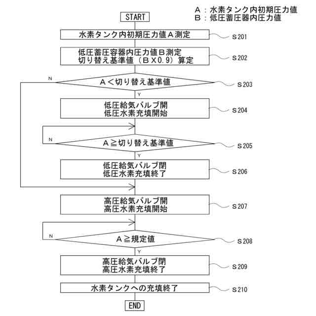 水素自動車の水素タンク内の圧力を検知する圧力センサAと、低圧蓄圧容器の圧力を検知する圧力センサBと、を持ち、