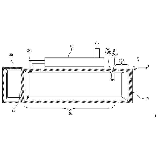 図7の構造において、訓練対象者Hは右側の煙調整フラッパー92と左側の扉23の間に位置し、所望の訓練作業をすることができる。この際、燃焼が発生しているのは煙調整フラッパー92よりも右側となるため、本体部10の内部の空間は、煙調整フラッパー92を境界として、その右側(x方向正側)が燃焼部10A、左側(x方向負側)が訓練室10Bとなる。図7において、本体部10における扉23付近の天井には排気口24が設けられ、濃煙Sは排気口24から排煙処理部40に吸引されて無害化処理される。この構造により、濃煙Sは煙調整フラッパー92の下側を通って燃焼部10Aから訓練室10Bの天井側を図中左側に向けて流れる。
