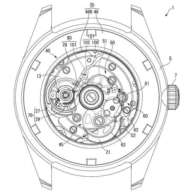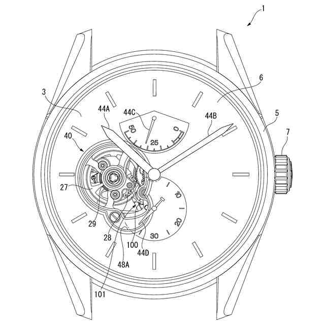 図1は、時計1を示す正面図であり、図2は、時計1を裏蓋側から見た図である。本実施形態では、時計1は、ユーザーの手首に装着される機械式の腕時計として構成される。そして、時計1は、文字板3側および裏蓋35側から、ムーブメント40の一部を視認できるシースルー構造になっている。
