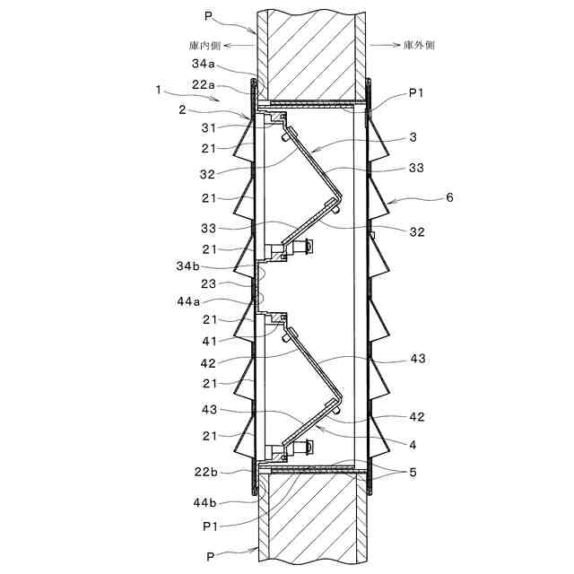 庫内気圧調整装置1は、庫内ルーバー2と、これに固着される上部及び下部の2つのベンチレータ3,4とを具備する。