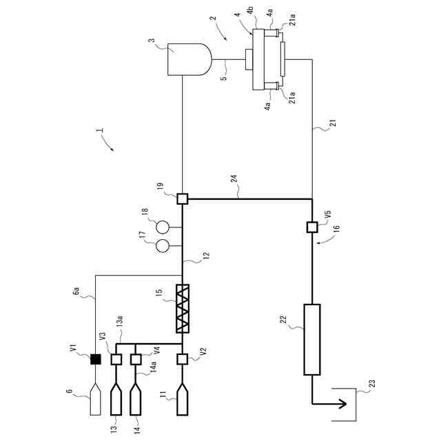 上記貯溜タンク3と蒸気供給手段11との間に配設された上記蒸気配管12には、蒸気供給手段11側から順に、制御手段によって制御される第2開閉弁V2、上記混合手段15、導電計17、温度計18、制御手段によって制御される三方弁19が設けられている。ここで、上記充填液配管6aは上記混合手段15と上記三方弁19との間に接続されている。