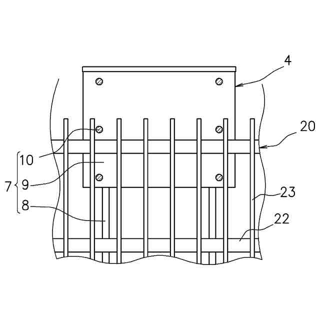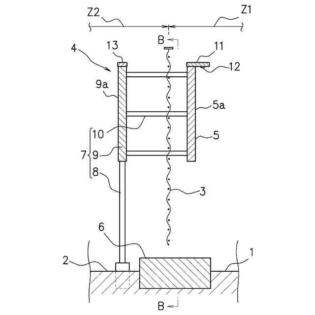 図13は、図12と同様、公園と道路の境界に境界物として柵102が設置されている例であるが、ここでは、公園外の道路にいる人に情報を表示するための掲示板101を、柵102の外側で柵102の土台103に載せ、柵102の外側に立て掛け、掲示板101の2本の支柱を各上下2カ所にて柵102の水平棒材等にワイヤー104で結び付けて固定している。なお、4本のワイヤー104のうち、1本は掲示板101の影となって図示されていない。この設置方法であれば、掲示板101は道路の通行人から見やすいと思われるが、ワイヤー104で結び付ける構造では固定の確実さが一定せず、掲示板101が柵102から離れて道路側に落下する危険性を否定できないという問題があった。