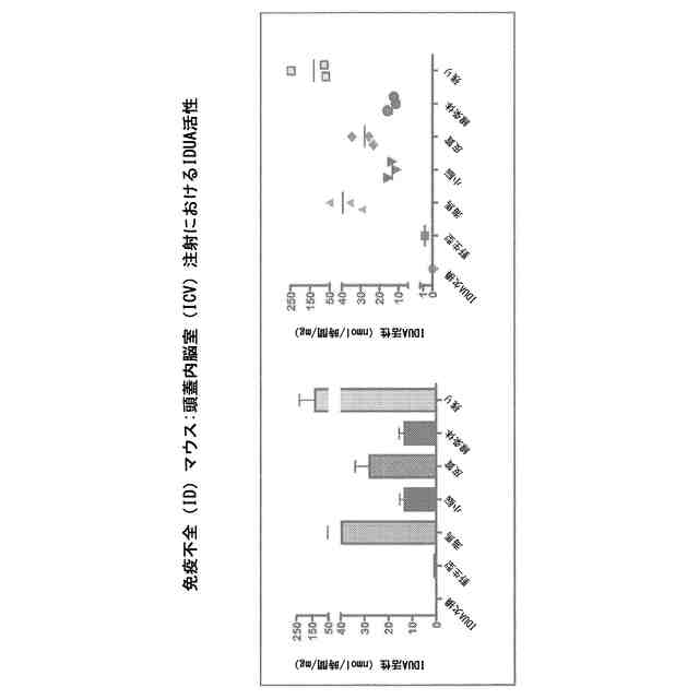 マウスに投与するとIDUA発現が起こり(Wolf et al., 2011)、その動物をIDUAに対して寛容化する。本明細書に記載するとおり、中枢神経系へのAAVの直接注入による成体(免疫適格)マウスへのAAVを介した遺伝子導入の適用可能性が、さまざまな投与経路を使って示された。例えば、免疫適格であるか、免疫不全(NODSCID/IDUA-/-)であるか、シクロホスファミド(CP)で免疫抑制されているか、または週に1回のヒトイズロニダーゼタンパク質(Aldurazyme)の注射を出生時から開始することによって免疫寛容化されているかのいずれかである成体IDUA欠損マウスの側脳室への直接注射によって、AAV-IDUA血清型9が投与された。CP免疫抑制動物には、鼻腔内注入、髄腔内注射、および血管内注入によっても、血液脳関門を破壊するためのマンニトールと共に、およびマンニトールなしで、AAV9-IDUAを投与した。ベクター投与の8週間後に動物を屠殺し、脳を回収し、IDUA酵素活性、組織グリコサミノグリカンおよびIDUAベクター配列を正常対照マウスおよび罹患対照マウスと比較して評価するために、顕微解剖した。これらの研究の結果は、例えばCNSにおいて、より高レベルのタンパク質送達および/または酵素活性が達成されるように、AAVベクターをCNSに直接投与するための数多くの経路を使用できることを示している。加えて、脳は免疫特権部位であるが、免疫抑制薬の投与または免疫寛容化によって、AAV投与後の脳に見いだされる活性が増加しうる。1回の投与あたりの発現レベルが高くかつ/または侵襲性の低い投与経路の方が、患者にとって臨床的に好ましい。