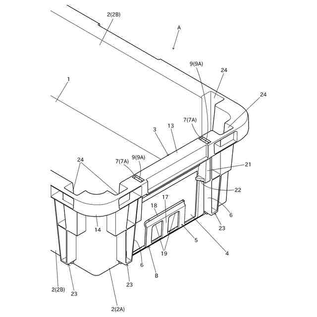 また、前記箱型容器Aは、対設する前記ガイド凸条6の夫々の上端部が臨設している前記フランジ部3の二箇所に前記差込用係合部7としての上側差込用係合部7Aが設けられていると共に、対設するガイド凸条6の夫々の下端部に前記差込用係合部7としての下側差込用係合部7Bが設けられており、