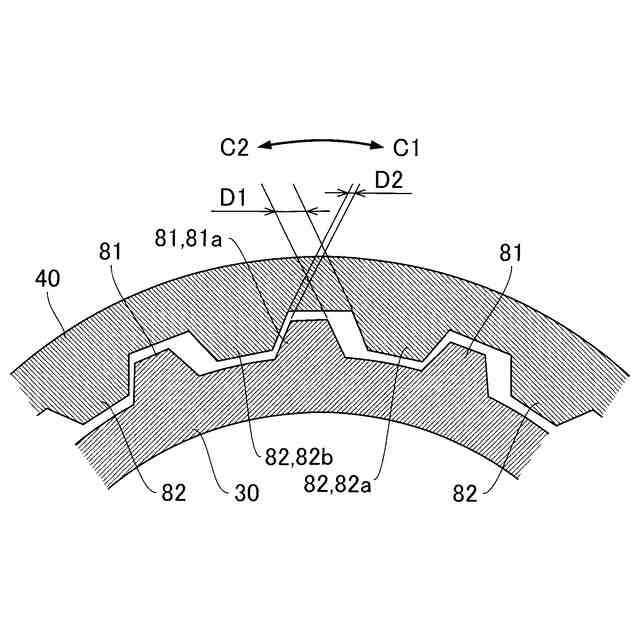 前記ギヤに動力が作用しない状態において、前記複数の第1突起の各々と当該第1突起に対して第1周方向に隣合う第2突起との第1間隔と、前記第1突起と当該第1突起に対して前記第1周方向とは反対の第2周方向に隣合う第2突起との第2間隔とは相違する