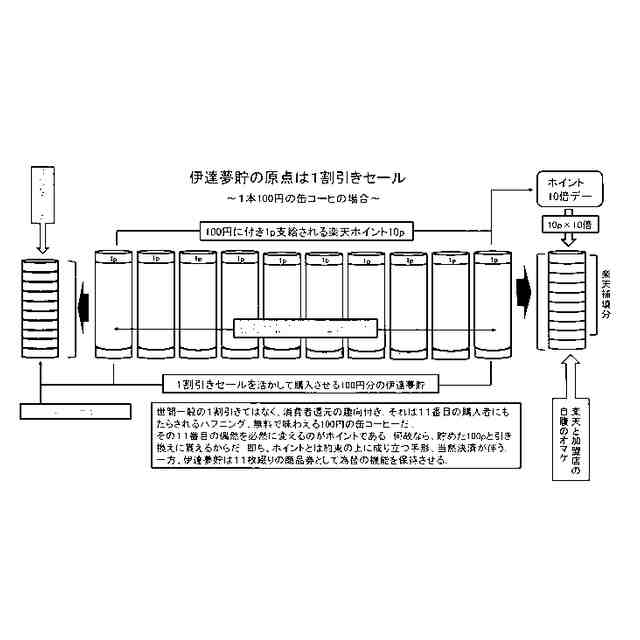 10倍デーに当たれば、100ポイントに膨らむ。これを使って11本目の缶コーヒーが只で貰える勘定だ。そして従来であれば、9割に当たる90円が楽天の経費に加算される。一方、1割引きセールで割り引かれる10円で購入した、10ポイントを10本分貯めた100ポイントを使っても、1本分のサービスは変わらないが、楽天の補填分90円に対して10円のポイント利益が計上される。
