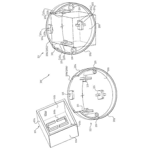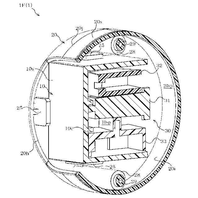 副部品20は、図1に示す第1形態1Fにおいては略球形状で、それ自体が転がり易い転動可能な構成である。したがって、物品供給装置からの供給・販売形態をとることができる。また、第1形態1Fにおける副部品20の内部空間20sp(図3参照)には、キャラクター(図8参照)用の部品である主部品10、及び連結部品30(図5参照)を収容する。なお、玩具1は、第1形態1Fにおいては、必要に応じて、図1に示す状態で更にその外側をラッピングフィルムにて覆うようにしても良い。