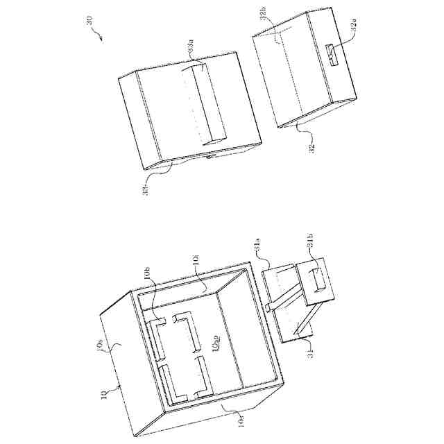 玩具1は、図1に示すように外観が略球形で成した第1形態1Fと、展示或いは遊戯形態である第2形態2F(図8参照)とに変化可能な玩具である。この第1形態1Fは、販売時の形態であり、球形状の外殻を成した副部品20によりその内部に多面体型形状の主部品10が保持されている。外殻を構成する副部品20は、例えば半球形の第1副部品21、及び第2副部品22の組合せにて構成されており、連結面部20jの部分により連結されている。例えば合成樹脂を素材として形成され適宜剛性を備えている。