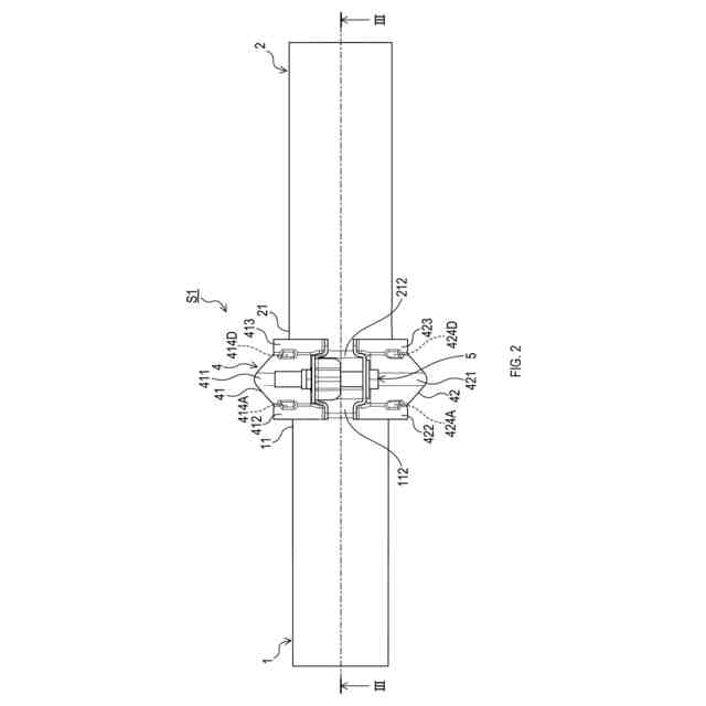 本開示の一態様では、クランプは、第1本体部と、第2本体部と、接続部と、第1フランジ部と、第2フランジ部と、を有してもよい。第1本体部は、膨出部及び拡径部の周方向における一部の領域を外周側から覆うように構成されている。第1本体部は、円弧状である。第2本体部は、膨出部及び拡径部の周方向における別の一部の領域を外周側から覆うように構成されている。第2本体部は、円弧状である。接続部は、第1本体部と第2本体部とを周方向に接続する。第1フランジ部は、第1本体部における接続部側と反対側の端部から径方向外側へ延びる。第2フランジ部は、第2本体部における接続部側と反対側の端部から径方向外側へ延びる。第2フランジ部は、第1フランジ部に締結するように構成される。少なくとも1つの凹部は、第1本体部の内周面に形成される第1凹部と、第2本体部の内周面に形成される第2凹部と、を含んでもよい。第1凹部及び第2凹部の少なくとも一方に、少なくとも1つの誘導部が形成されていてもよい。