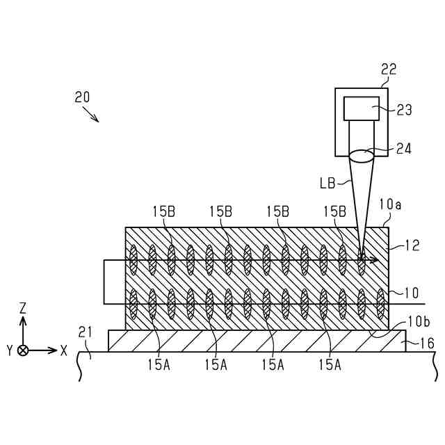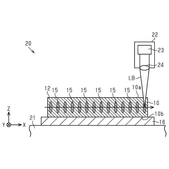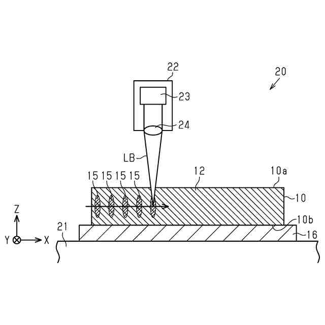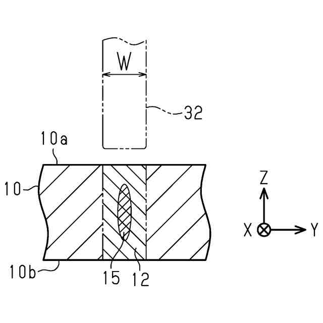 図13に示すように、特許文献1では、ブレード101による切削加工時にウエハ100の裏面100b付近に欠けが生じることを抑えるべく、ブレード101の進行方向の両側に改質層102が形成されている。改質層102は、ウエハ100の裏面100bに露出するように形成されている。