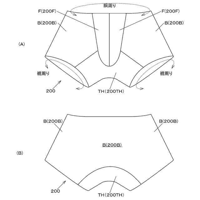 しかし、身体を平面上に投影したような平面的なパターンに沿って裁断された生地片を縫製して立体形状に仕立て上げても、三次元の複雑な曲面形状を呈する人の腹部、臀部、脚部に対応するのは極めて困難であり、不快な着圧を回避するためにパターンを大きめに構成すると、だぶつきが生じて脚部が臀部側に引き上がったりして着心地が悪くなるばかりか美観が損なわれるという問題点があった。