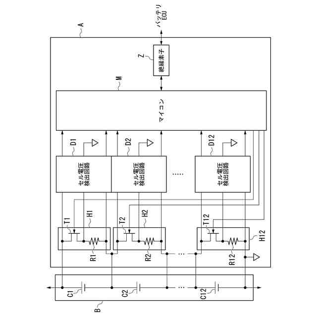 【解決手段】スイッチング素子と温度上昇により抵抗値が増加する可変抵抗器との直列回路として構成され、バッテリを構成する複数のバッテリセルの各々に並列接続された複数の放電回路と、複数のバッテリセルのセル電圧を各々検出する第1の電圧検出回路と、複数のスイッチング素子の両端電圧を各々検出する第2の電圧検出回路と、セル電圧に基づいて複数のセル電圧を均等化するようにスイッチング素子をオン/オフ制御する制御部とを備え、制御部は、オン/オフ制御によってスイッチング素子の両端電圧が所定の電圧しきい値を上回ると、制御方式をオン/オフ制御からデューティ制御に切替えることによって放電電流の低下を抑制する。