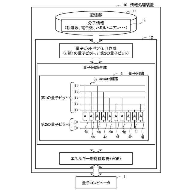 【解決手段】情報処理装置10は、第1の量子ビットと第2の量子ビットとを組み合わせた複数の量子ビットペアを作成する。第1の量子ビットは、初期配置において電子が存在する第1の軌道に対応する。第2の量子ビットは、初期配置において電子が存在しない第2の軌道に対応する。情報処理装置10は、2量子ビットゲート4a~4jを、複数の量子ビットペアのうちの少なくとも一部に作用させる量子回路3を生成する。2量子ビットゲート4a~4jは、第1の量子ビットと第2の量子ビットとの状態を入れ替えない第1の状態と入れ替えられた第2の状態とのパラメータの値に応じた重ね合わせ状態を生じさせる量子ゲートである。量子回路3を量子コンピュータ1に繰り返し実行させることで、分子の基底状態でのエネルギー期待値を取得する。