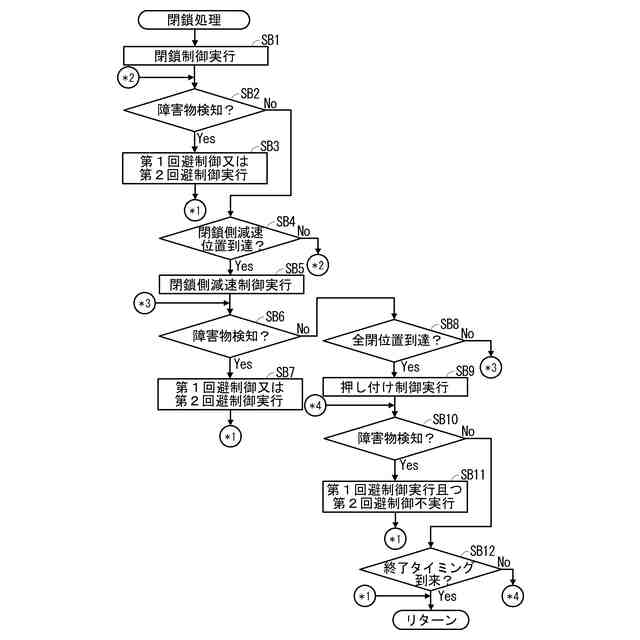 前記開閉体が閉鎖移動している場合において、前記全閉位置検知手段によって前記全閉位置に前記開閉体が到達していることが検知されていないものの、前記第2障害物検知手段によって前記障害物が検知される場合には、前記開閉体の開閉移動に関する制御であって、少なくとも前記開閉体による前記障害物の挟み込みを回避する制御である第2回避制御を行い、
