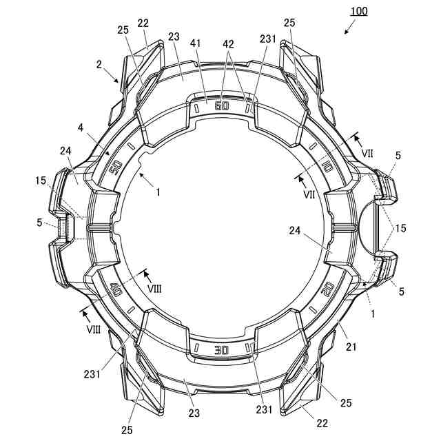 図1から図8を参照しつつ、本発明に係る機器ケース100の一実施形態について説明する。本実施形態では機器ケース100が時計(腕時計)のケースである場合を例示している。図1から図8では、時計を腕に装着するためのバンドや時計内部の構成等の図示を省略している。また、実施形態では、機器ケース100が平面視においてほぼ円形状である場合を例示するが(図1等参照)、機器ケース100の形状はこれに限定されず、例えば平面視矩形状や楕円形状等であってもよい。なお、以下に述べる実施形態には、本発明を実施するために技術的に好ましい種々の限定が付されているが、本発明の範囲を以下の実施形態及び図示例に限定するものではない。