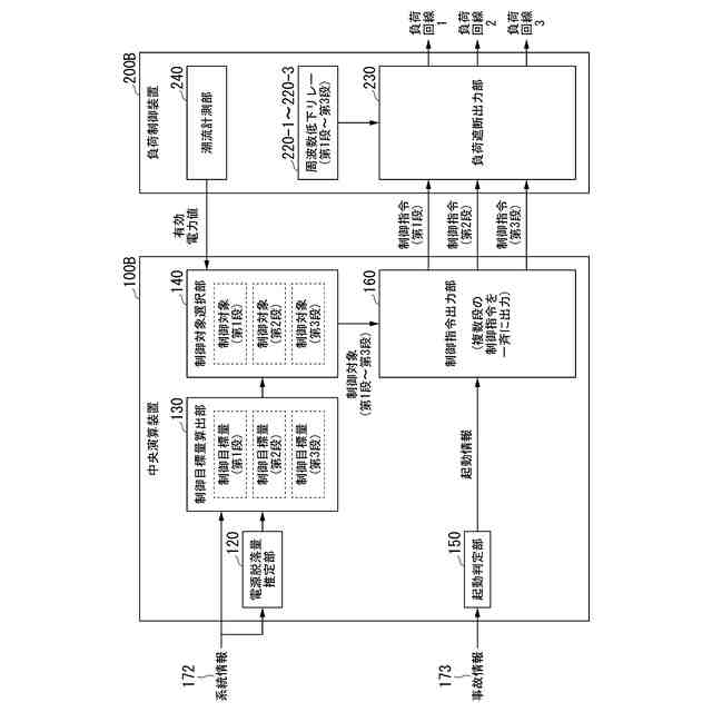 中央演算装置100は、電力系統で電源脱落事故が発生した際に、負荷制御装置200に対して負荷回線を制御するための制御指令を出力するコンピュータである。中央演算装置100は、系統安定化装置の一例である。