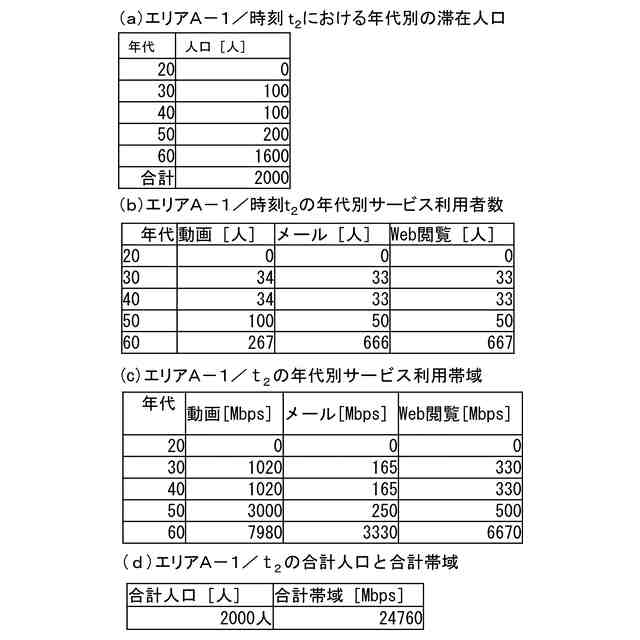 前記注目時刻における前記注目エリアのユーザ属性毎の人口と、前記属性別サービス利用割合情報とに基づいて、前記注目時刻に前記注目エリアにおけるユーザ属性毎且つネットワークサービス毎の前記ユーザが利用する帯域であるユーザ属性別サービス利用帯域を求め、