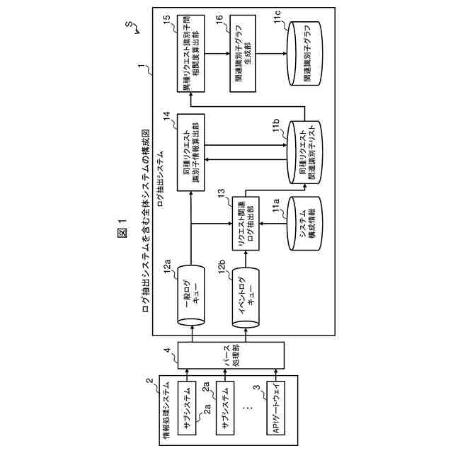 【解決手段】ログ抽出方法では、同種のリクエストに係るログを把握し、このログに含まれる識別子を識別する識別子キーと、ログにおいて識別子が取る値を表す識別子バリューと、の対応関係を管理する同種リクエスト関連識別子リストを生成する。またログ抽出方法では、同種リクエスト関連識別子リストにおいて、異種のリクエストに対応付けられている同一の識別子の識別子バリューに基づいて、異種の前記リクエスト間における該識別子バリューの相関度を算出する。そしてログ抽出方法では、識別子キーをノード、識別子キーと識別子との関係をリンク、相関度をリンクメトリックスとして、識別子キーをリンクメトリックスに基づいてグループ化した関連識別子グラフを生成する。