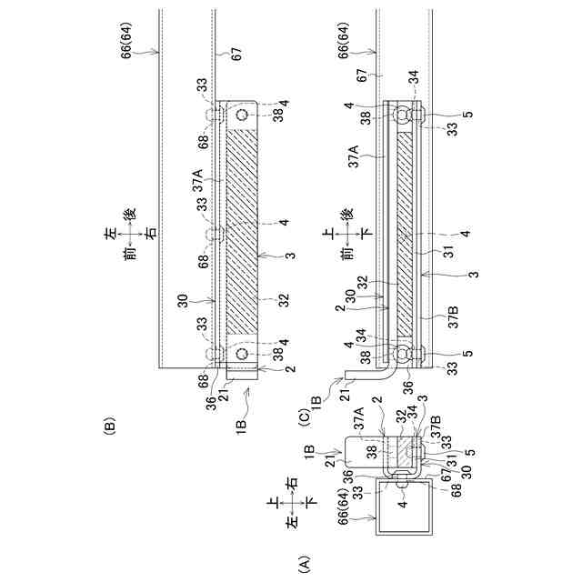 形態3の制振ストッパーの説明図で、(A)が正面、(B)が平面、(C)が側面をそれぞれ示す。