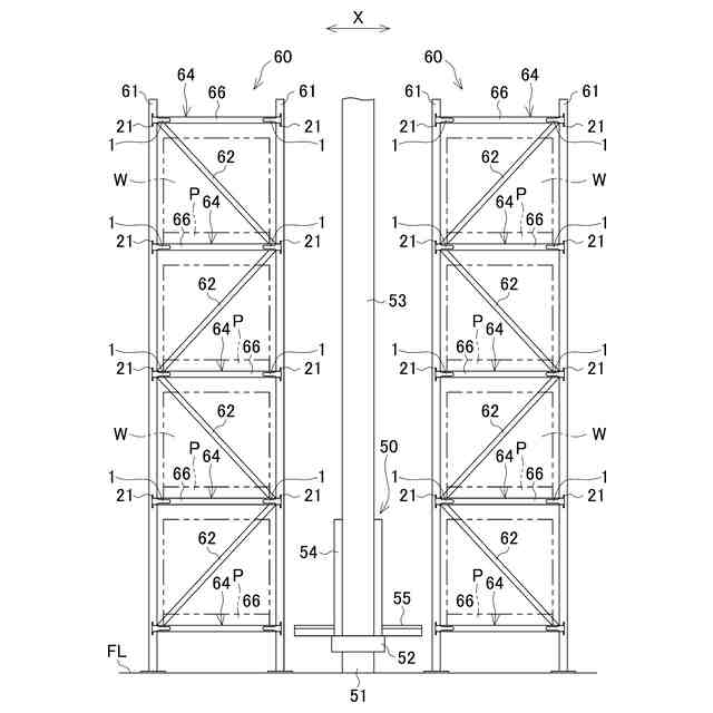 自動倉庫のラックには、スタッカクレーンの経路に沿った水平方向である左右方向に、所定間隔をおいて複数の支柱が配列されると共に、その支柱の列が、左右方向と直交する前後方向に2列配列されている。この支柱によって、上下方向と左右方向とに複数の棚部が支持されている。各棚部は、支柱によって左右方向へ水平に支持される支持部材と、支持部材によって前後方向へ水平に支持される筒状の荷受部材とで形成されており、スタッカクレーンによって棚部の上面に積荷が前後方向から出し入れ可能となっている。
