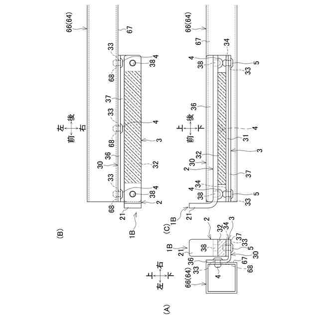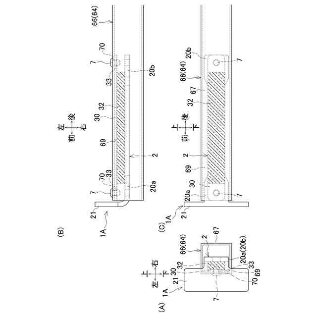 係止部材2は、荷受部材66の右側の外側面67と平行に前後方向へ延びる金属製の帯板である。係止部材2は、荷受部材66の上下高さの略半分の上下幅となっているが、前部は、前方へ向かうに従ってテーパ状に幅が拡がって荷受部材66の上下高さより僅かに上下幅が小さい幅広部20となっている。幅広部20は、荷受部材66の前方で左側へ直角に折り曲げられて、前端に係止部21を形成している。係止部21は、荷受部材66と前後方向で重なり、荷受部材66よりも上下寸法が大きい正面視縦長矩形状となっている。係止部21は、係止部材2の上下方向の中心に対して上下対称形状となっている。係止部材2には、リベット止め用の透孔22,22が、前後方向に所定間隔をおいて形成されている。