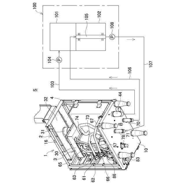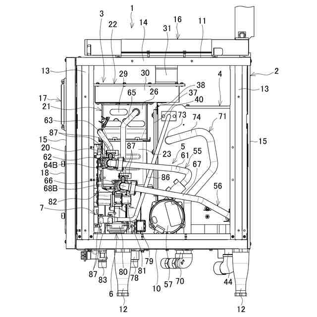 筐体2は、底板10と、天板11と、4本の脚12,12・・と、4本の縦フレーム13,13・・と、4本の横フレーム14,14・・と、4枚の外パネル15,15・・とを含んでなる。底板10は、平面視矩形状で、四辺がそれぞれ上向きに折り返されている。各脚12は、底板10の下面四隅で下向きに取り付けられて底板10を水平に支持している。各縦フレーム13は、底板10の折り返し部に固定されて底板10の四隅に立設されている。各横フレーム14は、前後左右に隣接する縦フレーム13,13の上端間に架設されている。天板11は、横フレーム14,14・・に取り付けられて筐体2の上面を閉塞している。天板11の上面には、熱源ユニット3の後述する排気部22に接続される排気ダクト16が設けられている。