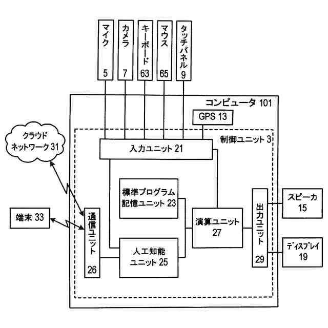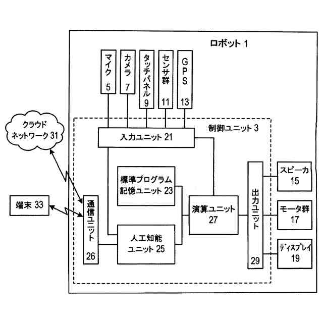 1、301…ロボット、3…制御ユニット、5…マイク、7…カメラ、9…タッチパネル、11…センサ群、13…GPS、15…スピーカ、17…モータ群、19…ディスプレイ、21…入力ユニット、23…標準プログラム記憶ユニット、25…人工知能ユニット、26…通信ユニット、27…演算ユニット、29…出力ユニット、31…クラウドネットワーク、33…端末、35…頭部、37…胴部、39…右腕部、41…左腕部、43…右脚部、45…左脚部、47、49…車輪、51…移動用モータ、53…首関節、55…肩関節、57…肘関節、59…手首関節、61…関節用モータ、63…キーボード、65…マウス、67…筐体、69…端子、71…車両制御部、101…コンピュータ、201…車載機