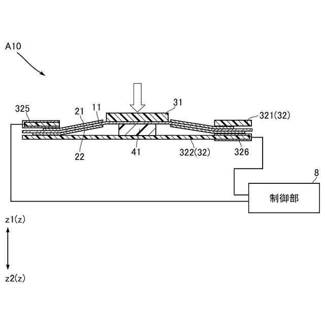 【解決手段】 圧力センサA10は、誘電エラストマ層11と、第1電極層21および第2電極層22と、第1支持体31および第2支持体32と、弾性部材41と、を備える。誘電エラストマ層11は、第1方向zに視て、第1支持体31の外縁から周囲に延出するように第1支持体31に固定されている。第2支持体32には、第1方向zに視て、誘電エラストマ層11の外端が固定されている。第1方向zにおいて、第1支持体31と第2支持体32との間に弾性部材41が介在している。