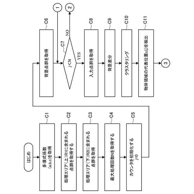 前記処理エリアは、実空間における鉛直方向に直交する所定の水平面を基準として、上に位置するエリアに対応する、センサ座標系における第1の処理エリアと、下に位置するエリアに対応する、前記センサ座標系における第2の処理エリアとを含む、