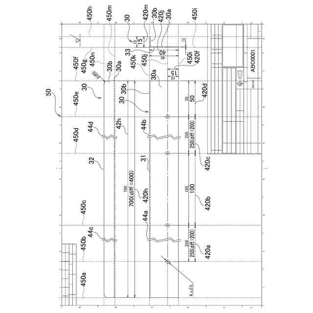 図19は、1またはそれ以上の実施形態に係る図形データ作成装置における作図支援装置から図形編集装置へと転送される、ガイド線を含む第2の例の図面画像を示す図である。