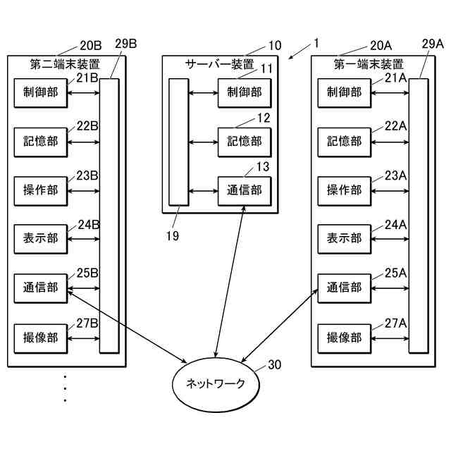 情報処理システム1は、図1に示すように、情報処理装置であるサーバー装置10と、第一端末装置20Aと、複数の第二端末装置20Bを含む。サーバー装置10、第一端末装置20A及び第二端末装置20Bは、ネットワーク30を介して通信可能に接続される。ネットワーク30は、例えば、インターネット、無線LAN(Local Area Network)、有線LAN、移動体通信ネットワーク、近距離無線通信網、あるいは、これらの一部又は全部の組合せ等の、任意の通信ネットワークである。なお、情報処理システム1は、第一端末装置20Aを複数備えていてもよい。