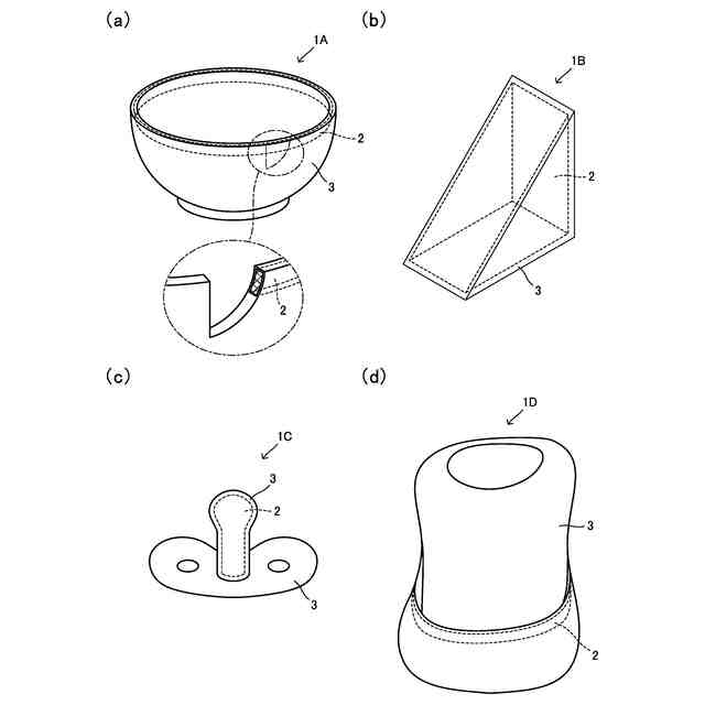 同実施形態に係る日用品の適用を説明するための図であり、(a)は茶碗、(b)は玩具(つみき)、(c)はおしゃぶり、(d)はポケット付きスタイを示している。