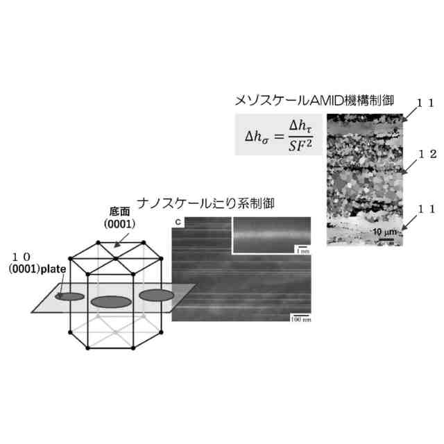このような状況下、既存の商用合金組成に捕らわれることなく新規な合金組成の開発とその組成に適した塑性加工プロセスの開発が進められてきた結果、αMg母相がランダム結晶配向した微細再結晶粒とhcp構造の柱面法線方向である<10-10>方位が押出方向に平行に並んだ強い集合組織(<10-10>繊維状集合組織)を有する粗大加工粒にバイモーダル化することで、強度と延性という相反する特性が同時に発現することがわかってきた。また、Mg