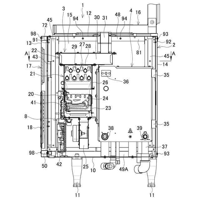 筐体2は、平面視矩形状の底板10の上方にフレーム構造を形成して前後方向に延びる直方体となっている。底板10は、下面に設けた脚11,11・・によって水平に支持される。筐体2の上面には天板12が設けられると共に、前後左右には、前パネル13、後パネル14、左右の側パネル15,15が設けられて各面が閉塞されている。天板12上には、排気ダクト16が設けられている。前パネル13には、上側に操作部17が、下側に給気部18がそれぞれ設けられている。筐体2内に、熱源ユニット3、タンク4、内部循環路5、ガス供給部6、注水部7、コントローラ8が収容されている。筐体2の詳細については後述する。