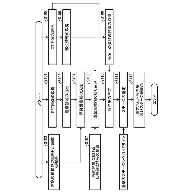 PET(Positron Emission Tomography)検査において、医師(読影医)は、PET画像中のRI(Radio Isotope)トレーサ(放射性薬剤)の集積位置を確認して読影する。しかしながら、近年、核医学の専門医が不足していること、医師は被検体の全身を読影する必要があるケースが増加していること、並びに、医師は、腫瘍(がん)の診断を行う際に、原発巣の推定、腫瘍の転移範囲の特定、及び、腫瘍のステージ(病期)の判定等を行うため、医師の読影負荷が高くなりつつある。このため、増大する医師の読影負荷を軽減することが望まれる。