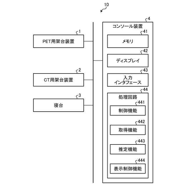 PET-CT装置10は、被検体からPET画像を収集するとともにCT画像を収集する装置である。被検体には、陽電子放出核種で標識された薬剤(RIトレーサ(放射性医薬品))が投与されている。PET画像は機能画像であり、CT画像は形態画像である。