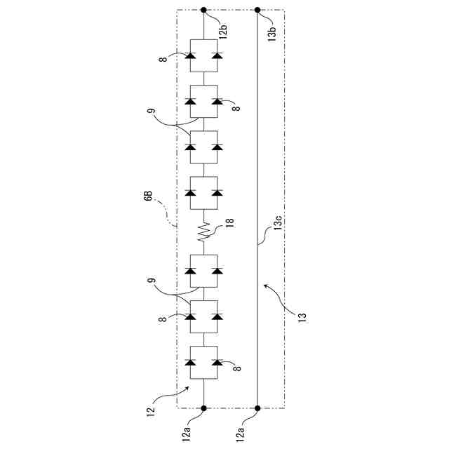 このような発光装置は、抵抗器の抵抗値によって各発光ダイオードに流れる電流値を調整できる一方で、線状又は帯状に発光させるための配線が長くなり、その内部抵抗に起因した電圧降下によって、電源から遠い側に配置された発光ダイオードに流れる電流値と、近い側に配置された発光ダイオードに流れる電流値とに差異が生じ、その全長方向で明るさに差が生じるという問題がある。