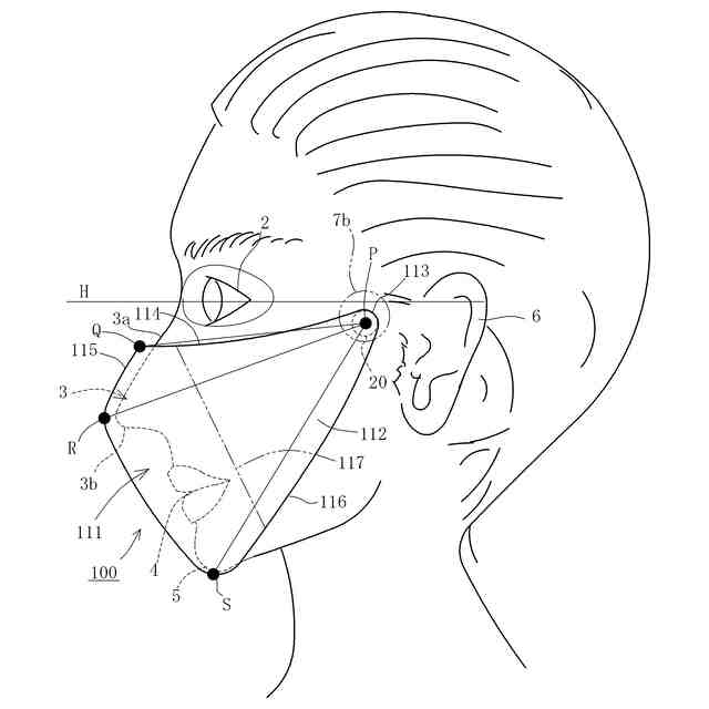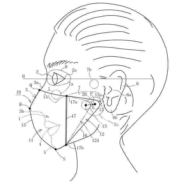 側方延出部12は、本体部11と別体であって、大きい伸縮性性を有し、開口部のない一枚布状素材からなり、本体部11と側方延出部12との連結部である接続ライン17を曲がり変形させずに均一に顔面へ密着させる。